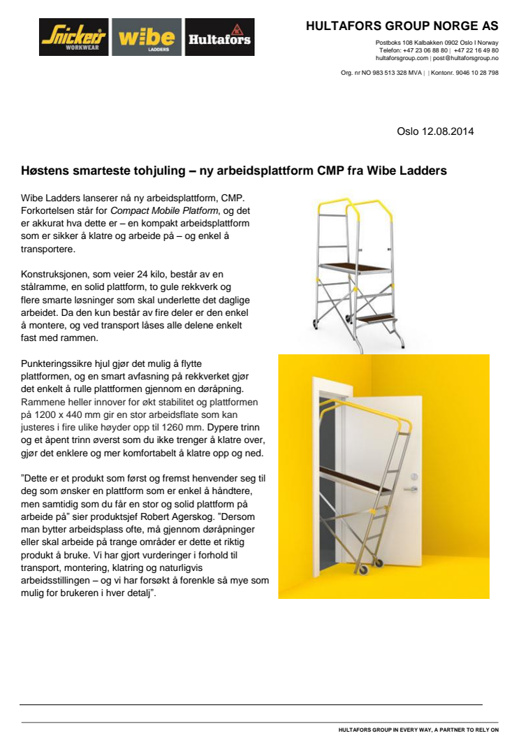 Wibe Ladders lanserer nå ny arbeidsplattform, CMP. Forkortelsen står for Compact Mobile Platform, og det er akkurat hva dette er – en kompakt arbeidsplattform som er sikker å klatre og arbeide på – og enkel å transportere.