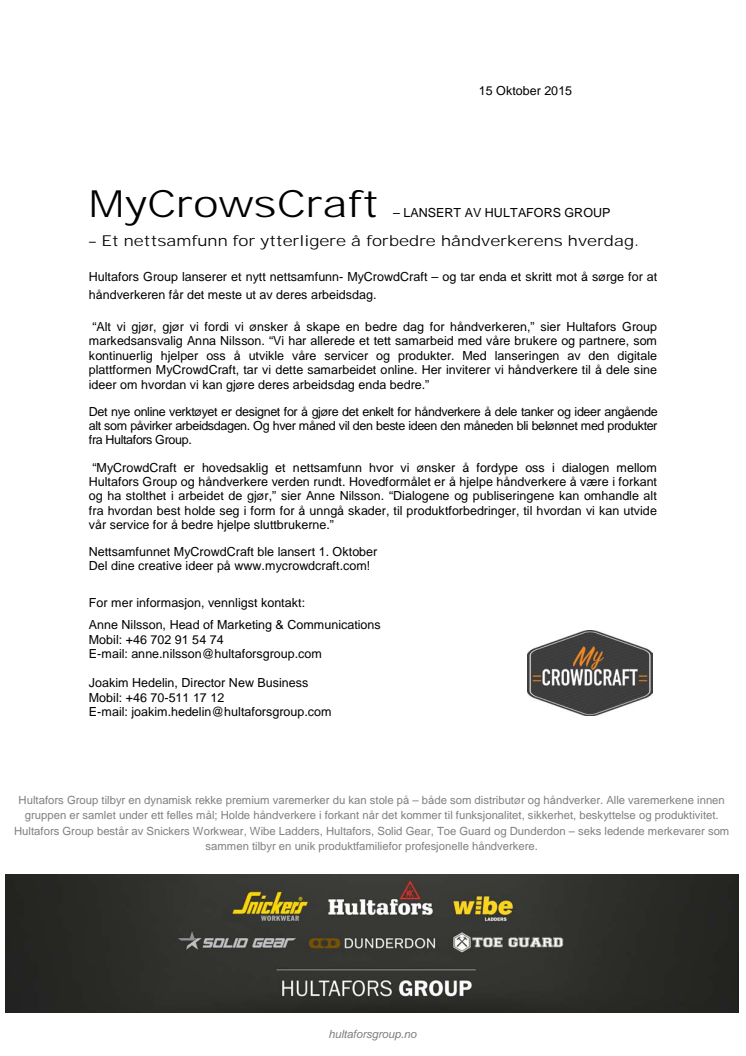 “Alt vi gjør, gjør vi fordi vi ønsker å skape en bedre dag for håndverkeren,” sier Hultafors Group markedsansvalig Anna Nilsson. “Vi har allerede et tett samarbeid med våre brukere og partnere, som kontinuerlig hjelper oss å utvikle våre servicer og produkter. Med lanseringen av den digitale plattformen MyCrowdCraft, tar vi dette samarbeidet online. Her inviterer vi håndverkere til å dele sine ideer om hvordan vi kan gjøre deres arbeidsdag enda bedre.”
