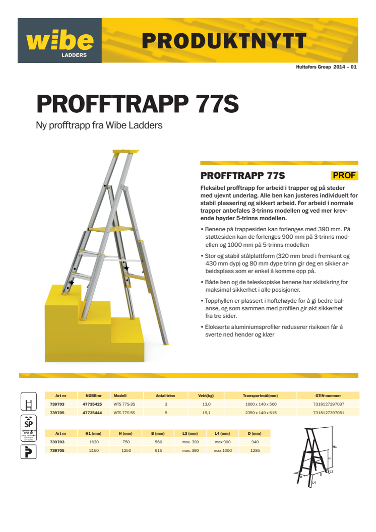 Etter omfattende produktutvikling og kontakt med personer fra fagforeninger og profesjonelle håndverkere, lanserer nå Wibe Ladders et helt nytt produkt i sitt sortiment av profftrapper. Med individuelt justerbare ben gir den nye 77S modellen en ny form av stabilitet i hvert trinn. ”Nå trenger du ikke lenger å stå ustødig når du skal male i trapper eller andre ujevne underlag”, sier Robert Agerskog, produktsjef hos Wibe Ladders.