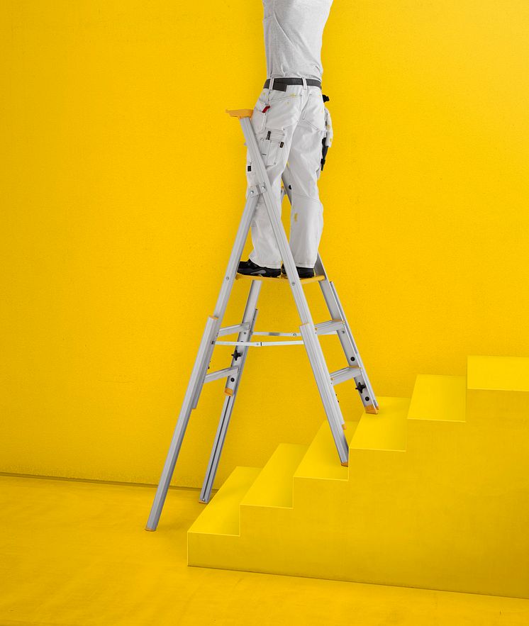 Fleksibel profftrapp for arbeid i trapper og på steder med ujevnt underlag. Alle ben kan justeres individuelt for stabil plassering og sikkert arbeid.