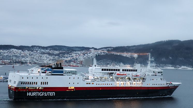 MS Vesterålen på vei ut fra kai i Trondheim. Foto: Per-Robin Gustafsson / Hurtigruten