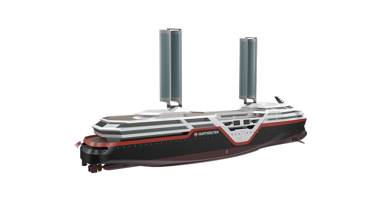 Designkonsept for Hurtigrutens Sea Zero-prosjekt. Målet er å lage verdens mest energieffektive skip, som kan seile uten utslipp i normal drift. Illustrasjon: Vard Design / Hurtigruten