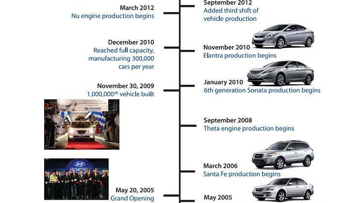 For ti år siden åpnet Hyundai sin første fabrikk i U.S.A. Det tok tre år å bygge anlegget i Montgomery, Alabama og i 2009 ble det utvidet til å kunne levere 300 000 biler i året. Totalt er det investert 1, 8 milliarder dollar og fabrikken er i dag arbeidsplass for 3 600 mennesker, i tillegg til 6 000 ansatte hos underleverandører i området. Fabrikken produseres Sonata og Elantra for det amerikanske markedet og over 2, 9 millioner biler er produsert siden åpningen 20. mai 2005.