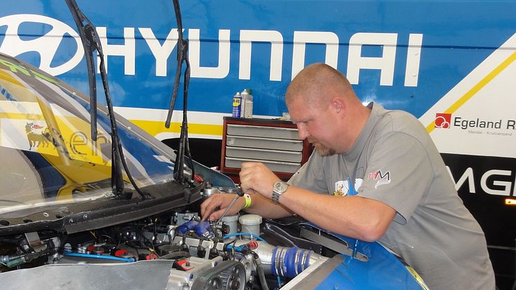 - Det var en fantastisk opplevelse, Jeg ble tatt i mot på beste måte av teamet og følte meg likestilt med dem fra første stund. Under selve løpet hadde jeg bestemte oppgaver, men ble også involvert i andre ting underveis, sier Jomar som jobbet i teamet fra fredag morgen til søndag ettermiddag. - På lørdagens kvalifisering fikk Frode en skade på høyre bakhjul, og det var totalt ubrukelig ved ankomst til depot. Vanligvis ville dette vært en litt omfattende reparasjon, men vi fikset det på en halvtimes tid! Fantastisk moro å være med på slikt teamarbeide, sier Jomar. Han jobber til daglig med å skru Hyundai hos Okkenhaug Bil, og kan bekrefte at det er en del ting som er forskjellig fra en standard Hyundai i20 til Frodes i20 med 600 hk.- Men kjernekunnskapen om bil var likevel uvurderlig for å kunne bidra i et slikt team, avslutter han.