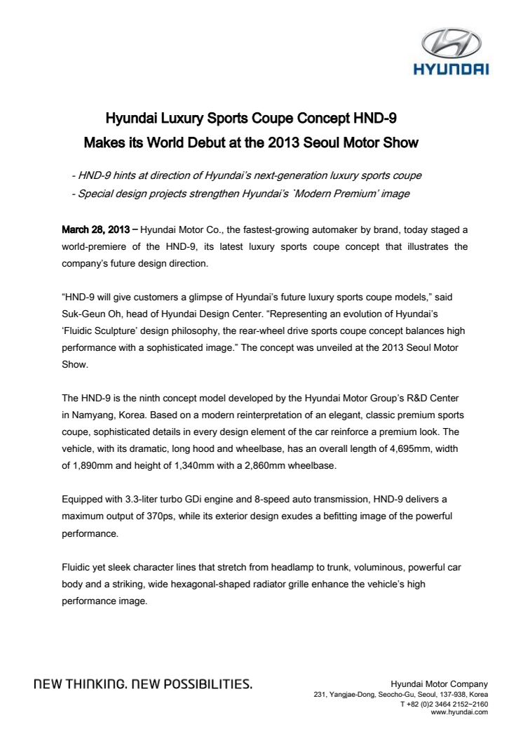 Hyundai har i dag verdenspremière på sin konseptbil, luksuskupeen HND-9, på bilmessen i Seoul.