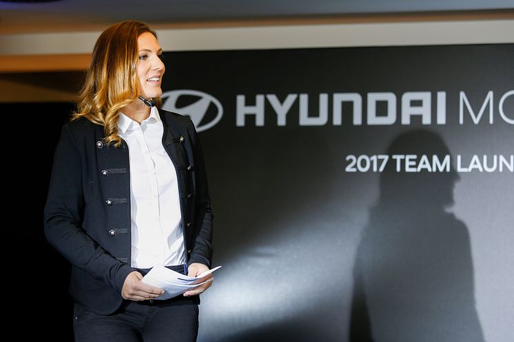 Molly Pettot, norsk konferansier på lanseringen av Hyundais nye i20 WRC