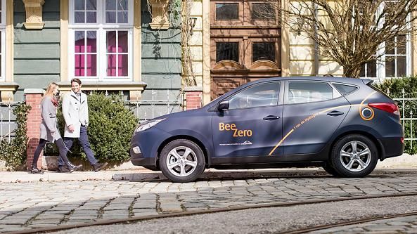 Billedtekst: Bor man i by og ikke eier en bil, kan det være greit å ha tilgang til bil uten utslipp når man skal på handle- eller helgetur med familien. I Munchen får medlemmene av BeeZeros bildeling nå tilgang til 50 stk Hyundai ix35 hydrogenelektriske biler med null utslipp.