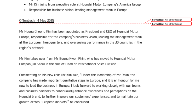 Hyung Cheong Kim (55) er utnevnt til president og CEO for Hyundai Motor Europa. I stillingen blir han ansvarlig for selskapets fremtidsplaner og visjoner, i tillegg til oppfølging av lederteamet og de 30 landene i regionen.