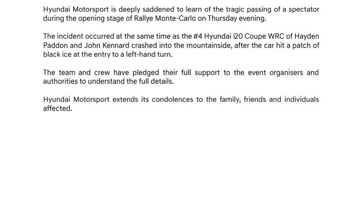 Men ikke alt var rosenrødt for Hyundai i går. New Zealenderen Hayden Paddon var uheldig og skled inni fjellveggen på isete underlag. I den forbindelse omkom en tilskuer og den etappen ble kansellert. Vedlagt ligger en uttalelse fra Hyundai Motorsport i den forbindelse.