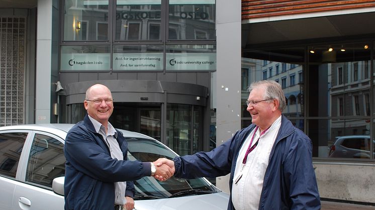 Billedtekst: Terje Wiik (til venstre) fra Hyundai overrekker undervisningsbilen, en Hyundai i10, til Dekan Per Øystein Staff utenfor Høgskolen i Oslo