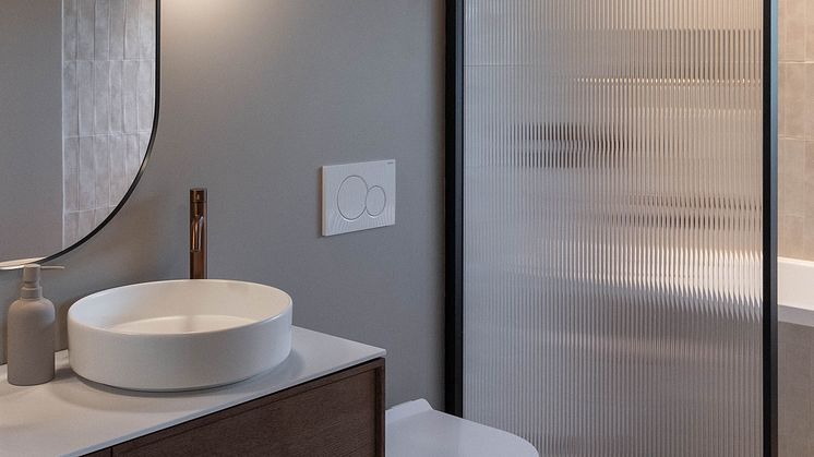 Badekaret var en selvfølge fra start, men Vibeke og Morten ville ikke gi slipp på tanken om dusjen. Vibeke hadde forelsket seg i det bølgeformede glasset Sway som hun visste ville passe veldig bra sammen med det øvrige farge- og materialvalget i beige og mørkt tre. Løsningen ble en dusjvegg fra INRs nye dusjserie EDGE mellom badekaret og resten av rommet, som en kombinert dusj og skillevegg. Den ekstra høye dusjløsningen gir en stilig og praktisk rom i rommet-løsning med privatliv for den som bader eller dusjer – praktisk når man er fem i familien.