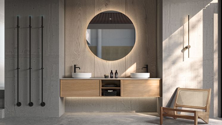 AIR forener tradisjonelle håndverksmetoder med moderne krav til romslig oppbevaring, lang holdbarhet og smarte tilvalg som for eksempel sensorstyrt belysning i og under servantskapet. AIR kommer i to særpregede utførelser: AIR Wood og AIR Solid.