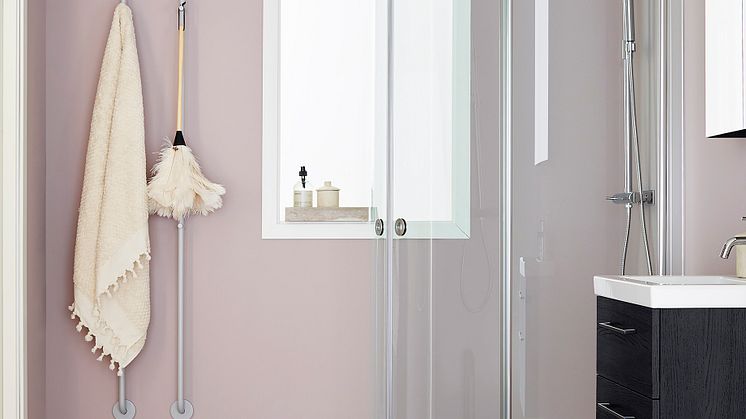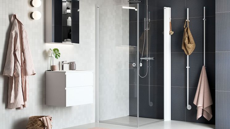 Ved å kombinere en dør med en fast vegg kan du plassere øvrig innredning helt inntil dusjen uten å risikere å slå imot noe.
