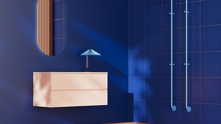 Servantskapet – i en myk ferskenfarge – tilfører varme og skaper balanse mot de kaldere fargene. Core Sense i NCS S 1015-Y60R.