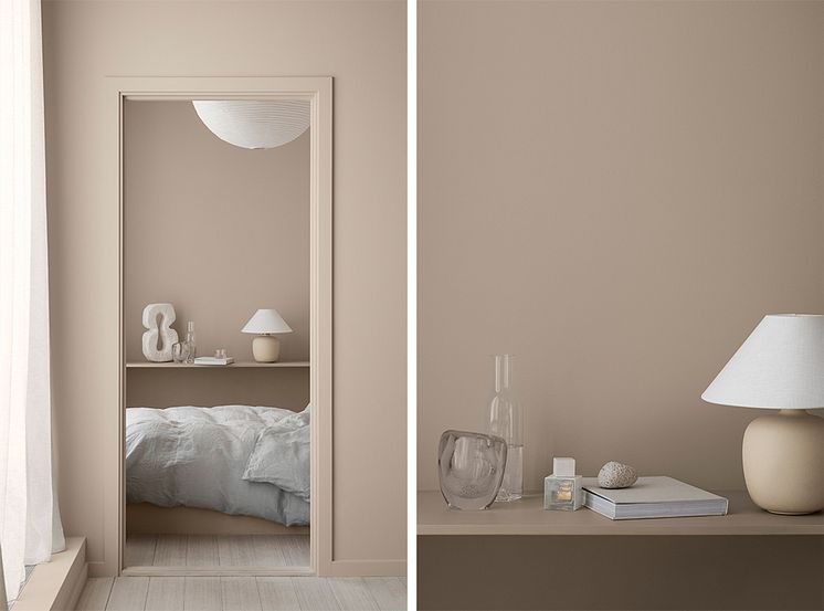 Våre to nye, støvede rosatoner har blitt svært populære på kort tid; dette er en hybrid mellom det beige og det rosa. Vegg: LADY Pure Color 20184 Thoughtful, hylle i halvblank glansgrad med LADY Supreme Finish. Vegg i front: LADY Pure Color 20185 Friendly Pink og lister i samme farge, malt med LADY Supreme Finish i matt glansgrad.