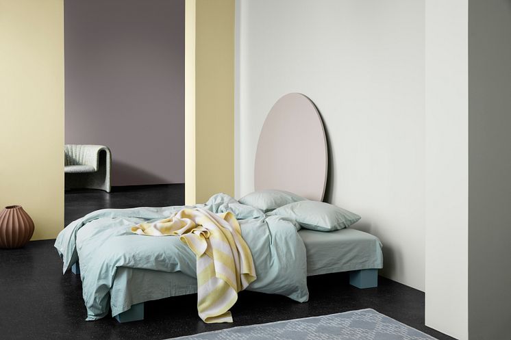 Lilla vegg i bakgrunnen: LADY Pure Color 3377 Slate Lavender – lysegul vegg i soverommet: LADY Pure Color 1775 Fresh Pasta, og taket er malt med samme farge med takmalingen LADY Perfection. Hvit vegg: LADY Pure Color 7236 Chi. Sirkel over sengen: LADY Supreme Finish Matt 20186 Lavender Touch.