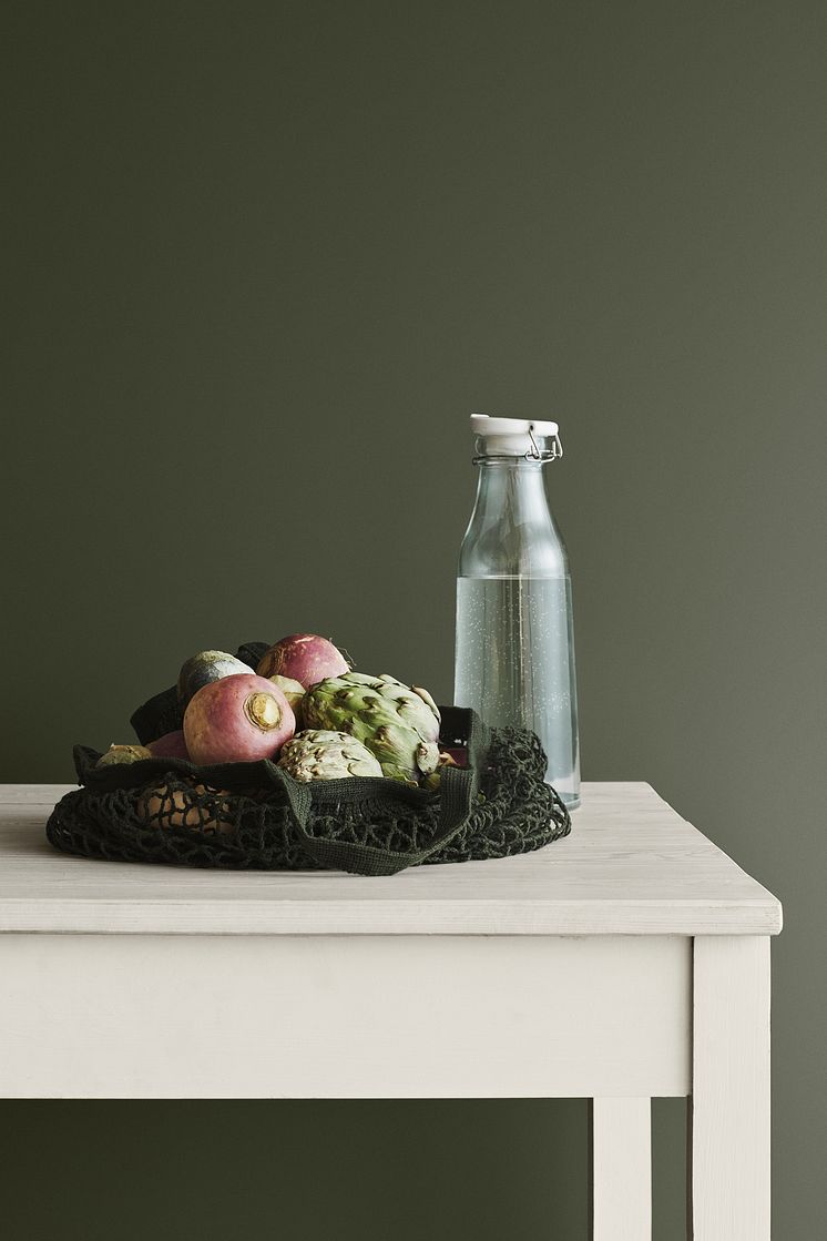 JOTUN LADY Supreme Finish 1024 Tidløs på bord. JOTUN LADY Pure Color 8494 Organic Green på vegg.