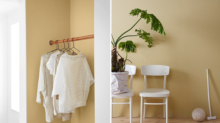 Positive farger i 2022! – I rom vi ikke oppholder oss over lang tid, tåler vi sterkere kulørte farger! – Hva med å tilføre entreen en ny gultone, som kan møte deg med en positiv energi – hver gang du går inn døren hjemme? Her to eksempler på entreer med fargen LADY 10246 Velvet. – LADY Wonderwall er både matt og ekstremt slitesterk – og en suveren veggmaling til gangen.
