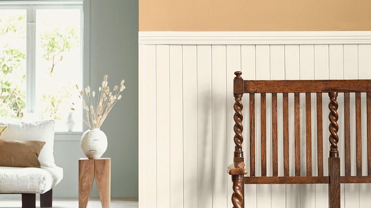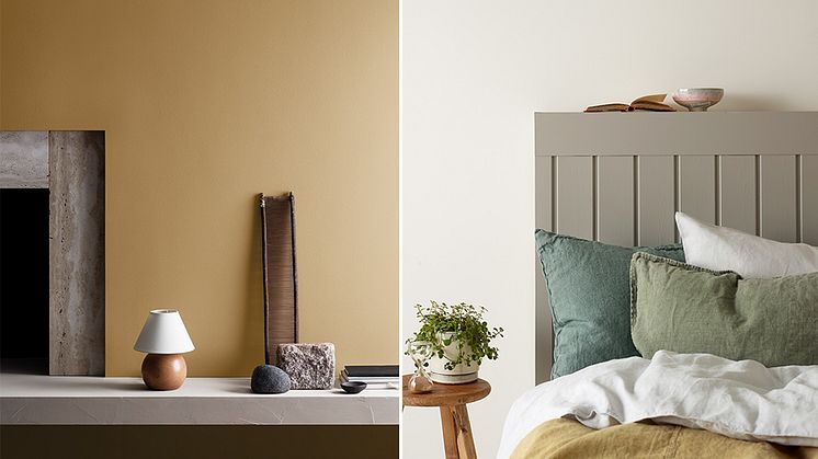 Rustikt og naturlig! Deilige okertoner som LADY Pure Color 1909 Kalkoker (til venstre), i møte med den svakt gylne, hvite Jotun Sens 0486 Silke – og en malt sengegavl i Sens 1233 Mohair.