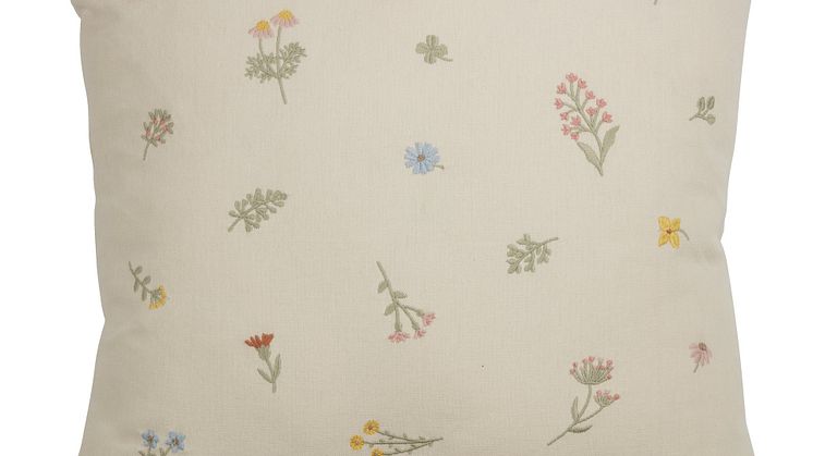En kuppelformet glassvase i nyanser av blått og rosa. En naturtro kunstig aloe vera-plante med litt rødt på toppen. En lys pyntepute med broderte sommerblomster fra grøftekanten.