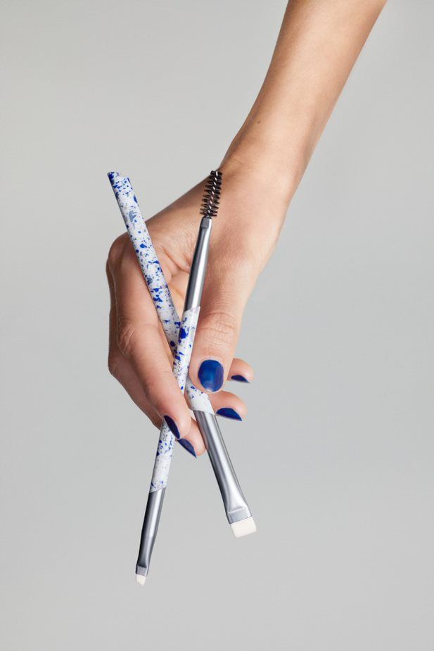 En duo-børste som gir øyebrynene dobbel definisjon. Den vinklede børsten bidrar til å skulpturere og forme brynene, mens den korte spolbørsten kammer ut og temmer de. I kombinasjon skaper de en intens look.