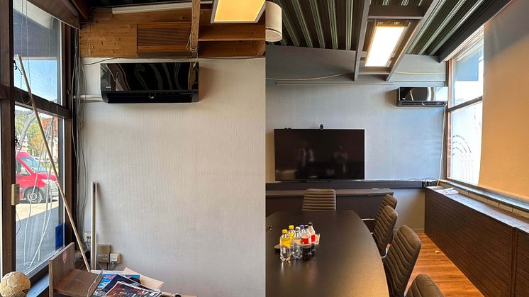 Den ene varmepumpen ble montert i det nyoppussede møterommet og den andre på et kontor som snart skal gjennomgå samme prosedyre. Begge rommene skal få en sårt tiltrengt oppgradering etter mange år uten fornyelse.