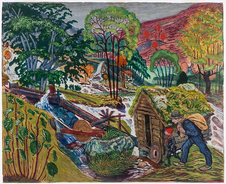 Nikolai Astrup: Kvennagong / Milling Weather, fargetresnitt, 1916