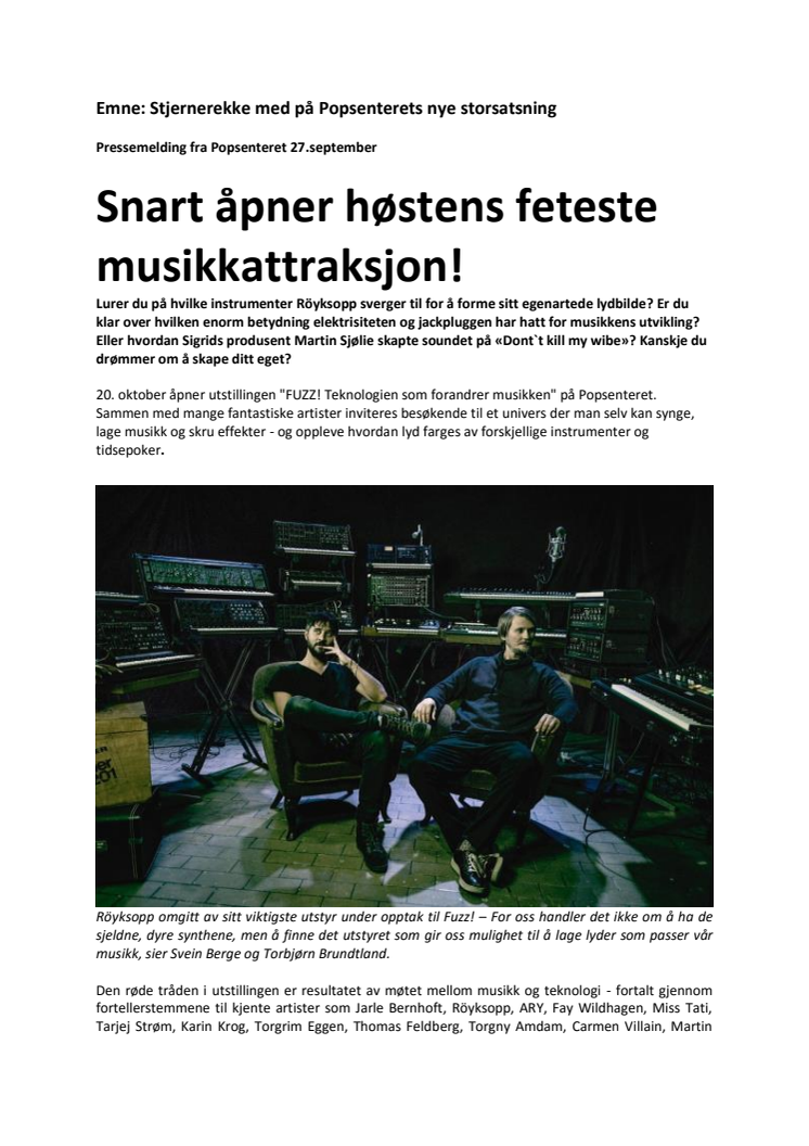 20. oktober åpner utstillingen "FUZZ! Teknologien som forandrer musikken" på Popsenteret. Sammen med mange fantastiske artister inviteres besøkende til et univers der man selv kan synge, lage musikk og skru effekter - og oppleve hvordan lyd farges av forskjellige instrumenter og tidsepoker.