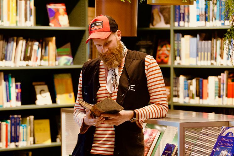 Bilde av ansatt i Deichman (Mathias Storm Michelsen Wisløff) som leser i førsteutgaven av Silt.