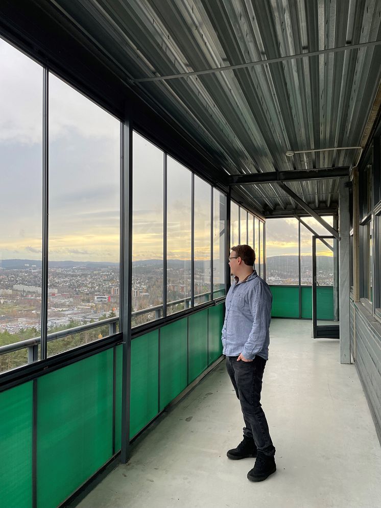 Står på fellesbalkongen i 6. etasje og ser utover Groruddalen.