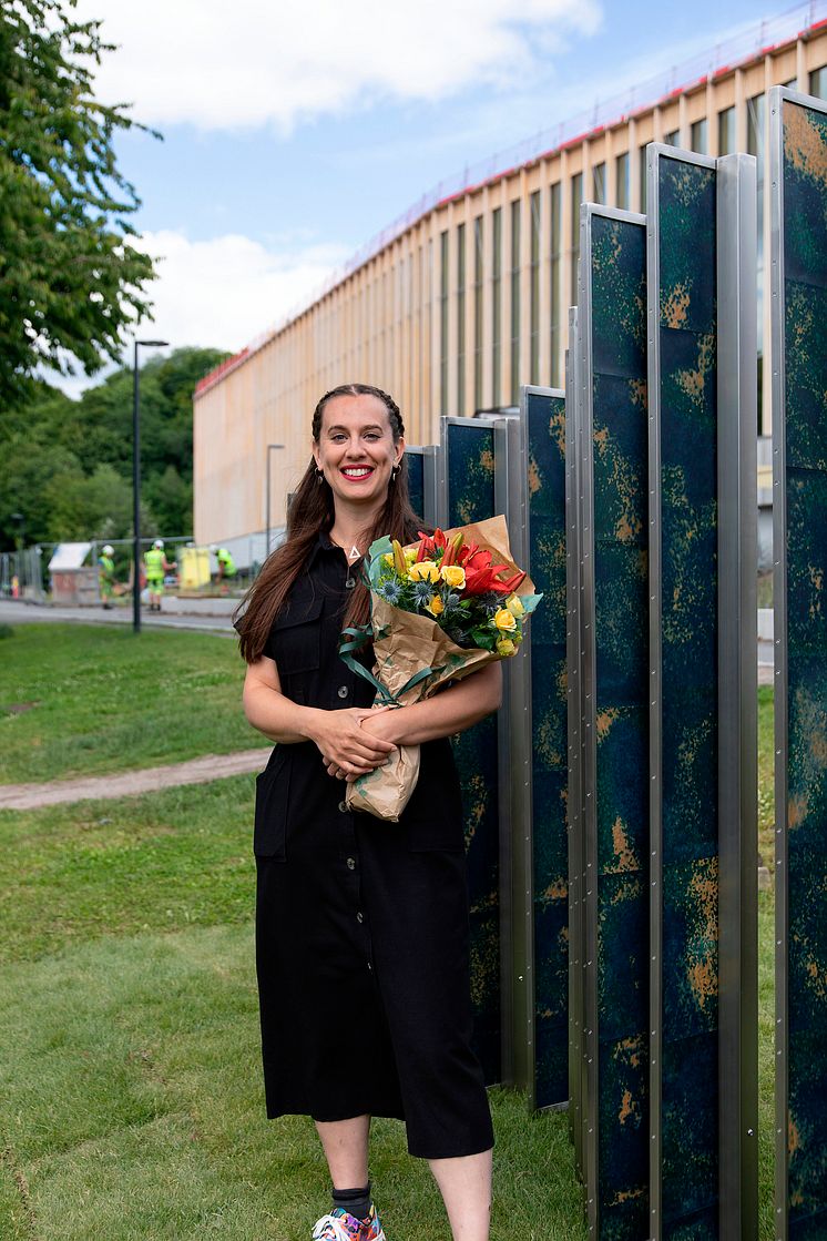 Aphra Shemza foran "Ocean rise" som står foran Tøyenbadet.