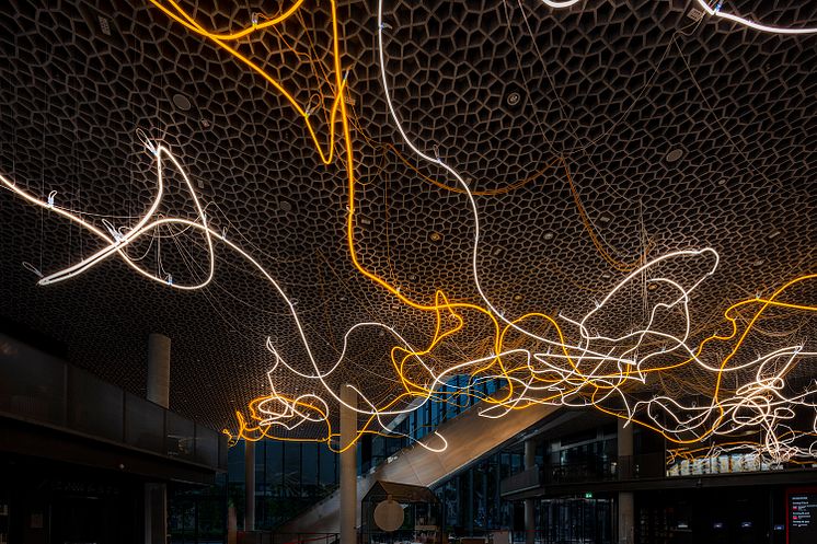 Kunstverk og neon-innstallasjon i 1. etg Deichman Bjørvika fra Oslo kommunes kunstsamling.
