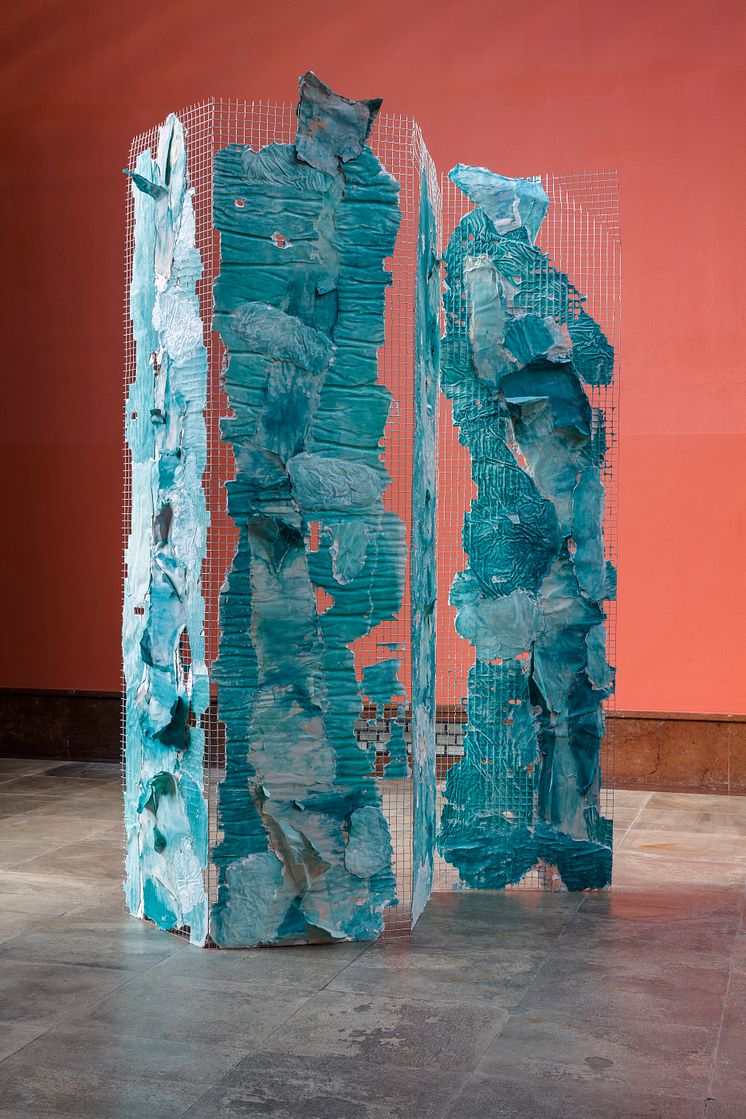 Kunstner Ann Iren Buan (f. 1984) med utstillingen "Around Us Surround Us" i Vigeland-museet i perioden 28. september 2018 - 20. januar 2019. Verk fra Vigeland-museets sal VII: Castles (Dark Aqua), 2018. Tørrpastell, papir, gips, Acrylic One, armering.