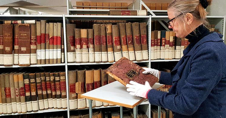 Kirsti Gulowsen, spesialkonsulent, Oslo byarkiv, viser frem en pasientprotokoll fra 1850 (Oslo Hospital)