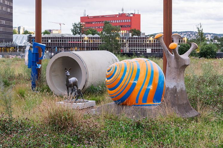 Skulpturpaviljong på Økern. I bildet: «Blå fugl – hommage à Tor Hoff» (u.d.) av Jørleif Uthaug (1911-1990),«Rådyr med kalv» (1990) av Skule Waksvik (1927–2018), og «Snegl» (1969) av Sivert Donali (1931-2010)