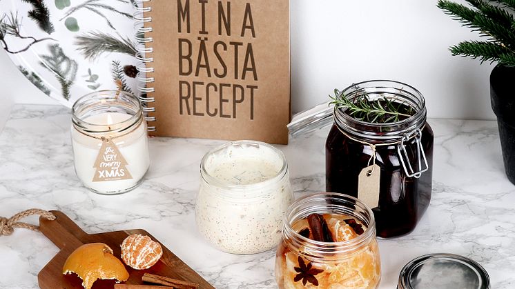 Tips! Det blir både morsommere og finere om du bruker ekstra fine glasskrukker og pynter dem med tråd og etiketter.