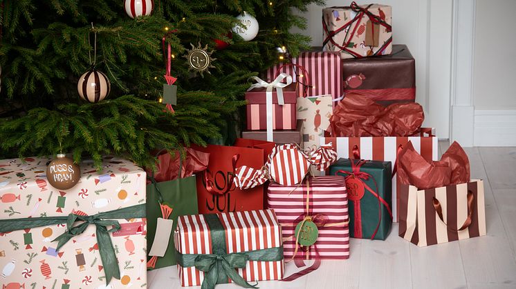 Samlingen inkluderer gavepapir i både klassiske julefarger som Ribb i rødt, brunt og grønt, samt herlige trendy elementer i form av det stripete gavepapiret Stripe og mønstret Karamell. Også bestselgeren fra forrige jul, Mini tree, kommer i ny form som papiret Luva.