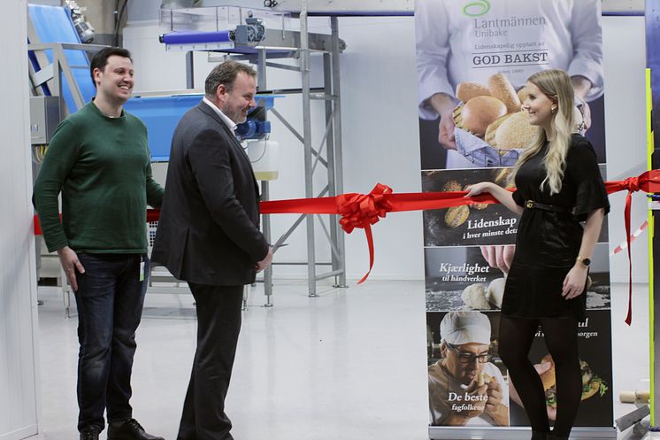 Fra åpning av ny hvetebakstlinje ved Lantmännen Unibake Norge på Langhus 11. januar 2019. Fra venstre: Thomas Walman (fabrikksjef), Thomas Bjarkholm (daglig leder), Anette Andersen (kategorisjef).