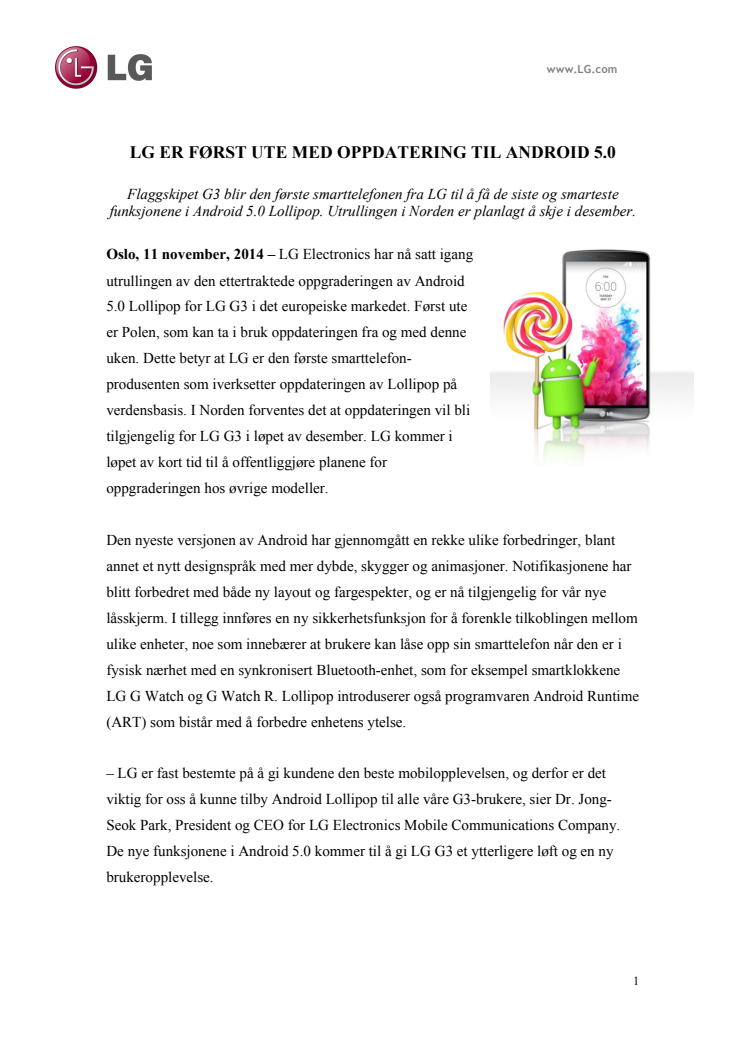 Flaggskipet G3 blir den første smarttelefonen fra LG til å få de siste og smarteste funksjonene i Android 5.0 Lollipop. Utrullingen i Norden er planlagt å skje i desember.