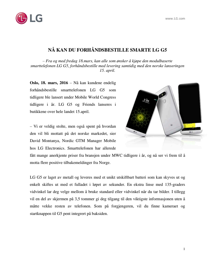 NÅ KAN DU FORHÅNDSBESTILLE SMARTE LG G5