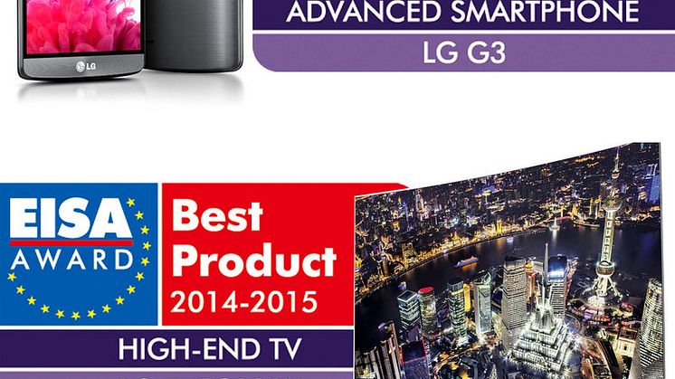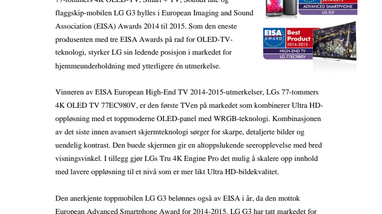 OSLO, 18. august 2014 – LG Electronics kan meddele at deres 77-tommers 4K OLED-TV, Smart + TV, SoundPlate og flaggskip-mobilen LG G3 hylles i European Imaging and Sound Association (EISA) Awards 2014 til 2015. Som den eneste produsenten med tre EISA Awards på rad for OLED-TV-teknologi, styrker LG sin ledende posisjon i markedet for hjemmeunderholdning med ytterligere én utmerkelse.