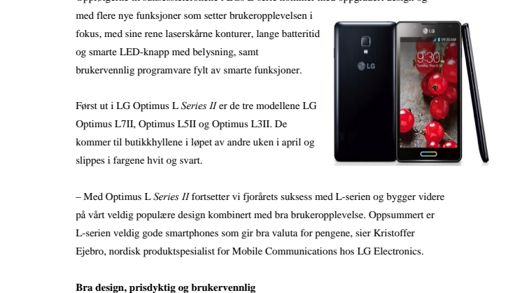 – Med Optimus L Series II fortsetter vi fjorårets suksess med L-serien og bygger videre på vårt veldig populære design kombinert med bra brukeropplevelse.Oppsummert er L-serien veldig gode smartphones som gir bra valuta for pengene, sier Kristoffer Ejebro, nordisk produktspesialist for Mobile Communications hos LG Electronics.