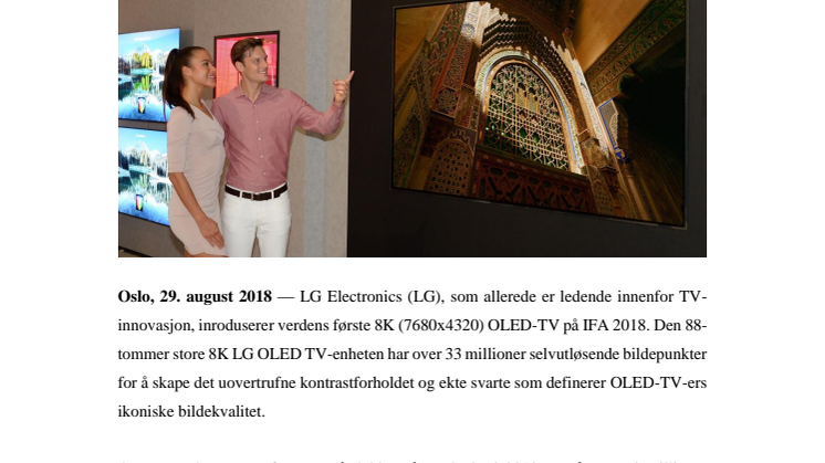 Oslo, 29. august 2018 — LG Electronics (LG), som allerede er ledende innenfor TV-innovasjon, inroduserer verdens første 8K (7680x4320) OLED-TV på IFA 2018. Den 88-tommer store 8K LG OLED TV-enheten har over 33 millioner selvutløsende bildepunkter for å skape det uovertrufne kontrastforholdet og ekte svarte som definerer OLED-TV-ers ikoniske bildekvalitet.