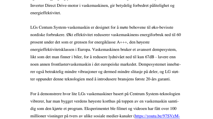 Oslo, 1.september, 2016 — Under IFA 2016 i Berlin vil LG Electronics vise frem sitt sortiment av supereffektive vaskemaskiner med Centrum System™-teknologi, som nå også blir tilgjengelig på det nordiske markedet. Teknologien, i kombinasjon med LGs Inverter Direct Drive-motor i vaskemaskinen, gir betydelig forbedret pålitelighet og energieffektivitet.