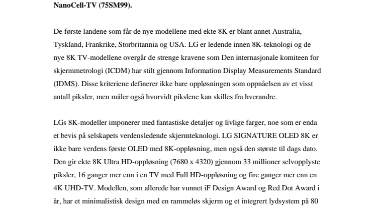 De første landene som får de nye modellene med ekte 8K er blant annet Australia, Tyskland, Frankrike, Storbritannia og USA. LG er ledende innen 8K-teknologi og de nye 8K TV-modellene overgår de strenge kravene som Den internasjonale komiteen for skjermmetrologi (ICDM) har stilt gjennom Information Display Measurements Standard (IDMS).Disse kriteriene definerer ikke bare oppløsningen somoppnåelsen av et visst antall piksler, men måler også hvorvidt pikslene kan skilles fra hverandre.