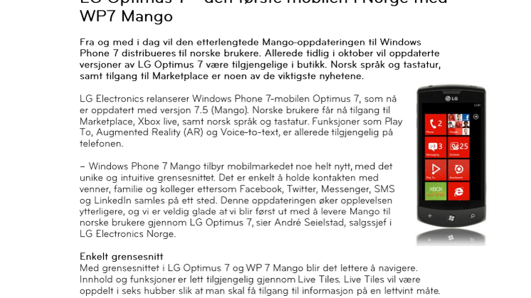 – Windows Phone 7 Mango tilbyr mobilmarkedet noe helt nytt, med det unike og intuitive grensesnittet. Det er enkelt å holde kontakten med venner, familie og kolleger ettersom Facebook, Twitter, Messenger, SMS og LinkedIn samles på ett sted. Denne oppdateringen øker opplevelsen ytterligere, og vi er veldig glade at vi blir først ut med å levere Mango til norske brukere gjennom LG Optimus 7, sier André Seielstad, salgssjef i LG Electronics Norge.