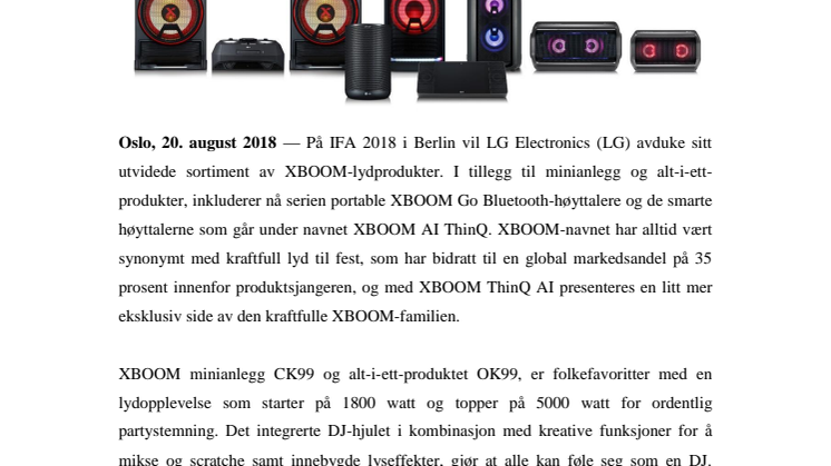 Oslo, 20. august 2018 — På IFA 2018 i Berlin vil LG Electronics (LG) avduke sitt utvidede sortiment av XBOOM-lydprodukter. I tillegg til minianlegg og alt-i-ett-produkter, inkluderer nå serien portable XBOOM Go Bluetooth-høyttalere og de smarte høyttalerne som går under navnet XBOOM AI ThinQ. XBOOM-navnet har alltid vært synonymt med kraftfull lyd til fest, som har bidratt til en global markedsandel på 35 prosent innenfor produktsjangeren, og med XBOOM ThinQ AI presenteres en litt mer eksklusiv side av den kraftfulle XBOOM-familien.