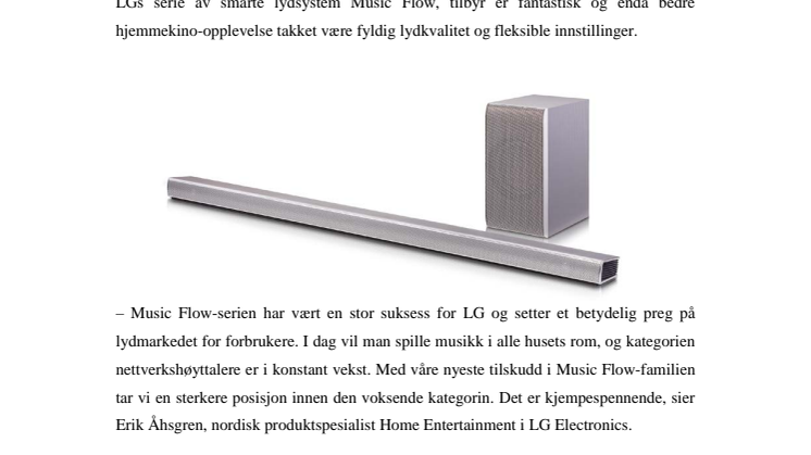 – Music Flow-serien har vært en stor suksess for LG og setter et betydelig preg på lydmarkedet for forbrukere. I dag vil man spille musikk i alle husets rom, og kategorien nettverkshøyttalere er i konstant vekst. Med våre nyeste tilskudd i Music Flow-familien tar vi en sterkere posisjon innen den voksende kategorin. Det er kjempespennende, sier Erik Åhsgren, nordisk produktspesialist Home Entertainment i LG Electronics.