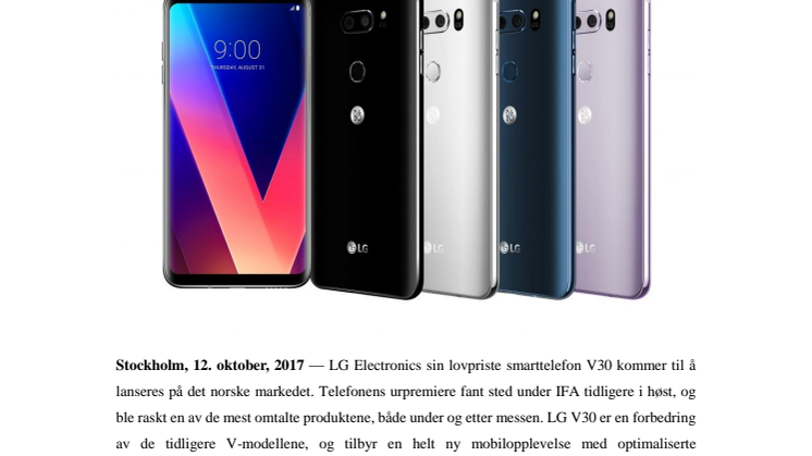 Stockholm, 12. oktober, 2017 — LG Electronics sin lovpriste smarttelefon V30 kommer til å lanseres på det norske markedet. Telefonens urpremiere fant sted under IFA tidligere i høst, og ble raskt en av de mest omtalte produktene, både under og etter messen. LG V30 er en forbedring av de tidligere V-modellene, og tilbyr en helt ny mobilopplevelse med optimaliserte multimediefunksjoner. Modellen er først på markedet med en rekke ulike funksjoner og egenskaper, eksempelvis det første mobilkameraet med en Crystal Clear-linse i glass, objektiv på 1.6, OLED FullVision bildeskjerm, Cine Video for å skape filmatiske videoklipp og mye mer. LG V30 setter rett og slett en ny standard for smarttelefoner i premiumsegmentet.