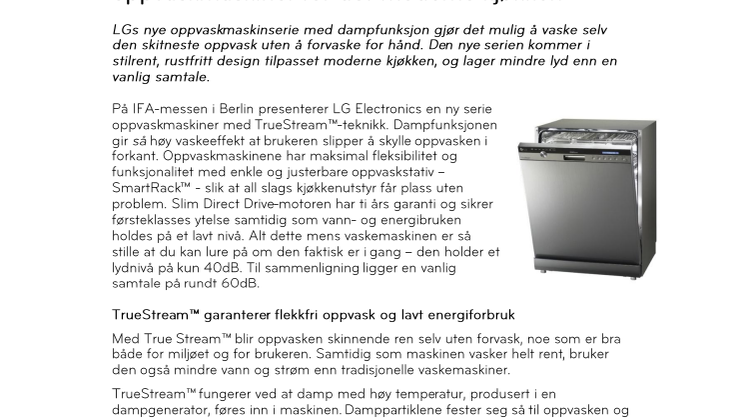 På IFA-messen i Berlin presenterer LG Electronics en ny serie oppvaskmaskiner med TrueStream™-teknikk. Dampfunksjonen gir så høy vaskeeffekt at brukeren slipper å skylle oppvasken i forkant. Oppvaskmaskinene har maksimal fleksibilitet og funksjonalitet med enkle og justerbare oppvaskstativ – SmartRack™ - slik at all slags kjøkkenutstyr får plass uten problem. Slim Direct Drive-motoren har ti års garanti og sikrer førsteklasses ytelse samtidig som vann- og energibruken holdes på et lavt nivå. Alt dette mens vaskemaskinen er så stille at du kan lure på om den faktisk er i gang – den holder et lydnivå på kun 40dB. Til sammenligning ligger en vanlig samtale på rundt 60dB.